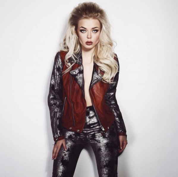 На фото 20-летняя девушка позирует в обтягивающих блестящих брюках и яркой косухе, надетой на голое тело. В добавок к этому ей сделали огромный начес и вызывающий яркий макияж.