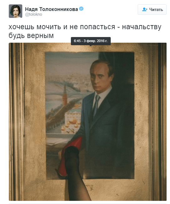 "Хочешь мочить и не попасться — начальству будь верным", — написала она.