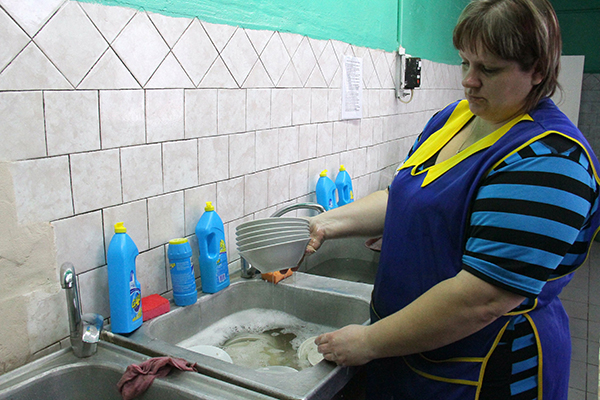 Мы заглянули на кухню и своими глазами посмотрели, как моется посуда в этой школьной столовой. На наших глазах посудомойка несколько раз вынула из огромной мойки несколько стопок тарелок, но ни одна из них не была битой или надколотой. Фельдшер школы Надежда Викторовна тоже подтвердила, что посуду поменяли два месяца назад.