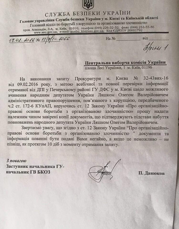 Согласно обнародованному документу, проверка проводится по информации от Печерской налоговой о возможном совершении Ляшко административного правонарушения, связанного с коррупцией. В частности, силовики обратились в ЦИК за информацией об основаниях приобретения полномочий народного депутата Ляшко.