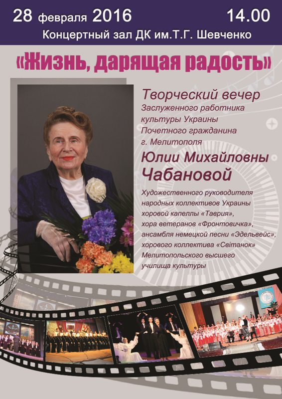 В воскресенье, 28 февраля, в концертном зале ДК им. Т. Шевченко в 14.00 состоится творческий вечер "Жизнь, дарящая радость" заслуженного работника культуры Украины, почетного гражданина Мелитополя Юлии Михайловны Чабановой.