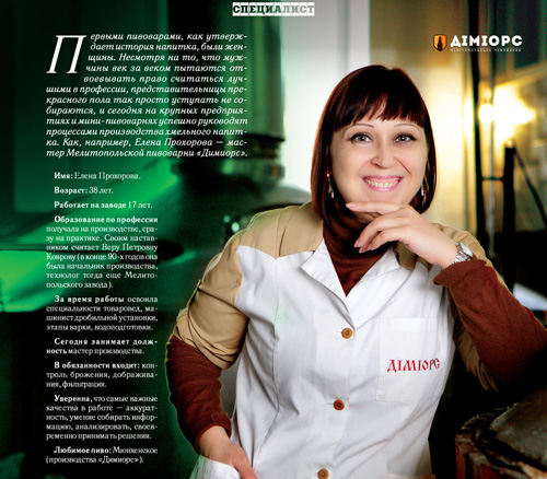 Тем не менее, представительницы прекрасного пола так просто мужчинам уступать не собираются, и сегодня на крупных предприятиях и мини- пивоварнях успешно руководят процессами производства хмельного напитка. Как, например, Елена Прохорова - мастер Мелитопольской пивоварни «Димиорс».