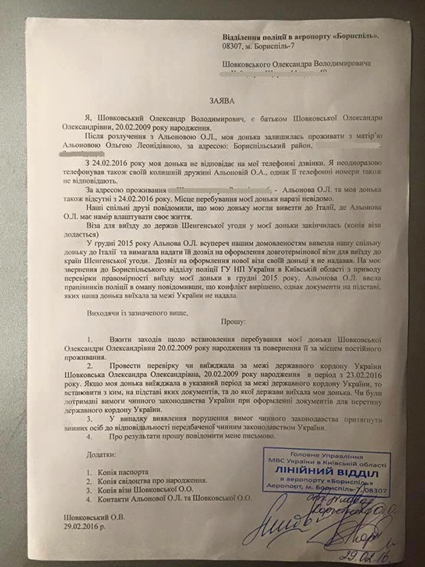 На вопрос, когда Сашенька последний раз посещала занятия, мне сообщили, что ребенок перестал ходить в школу и причина ее отсутствия не известна. Ее нет и по месту проживания", – написал Шовковский в Facebook и прикрепил скан заявления в полицию.