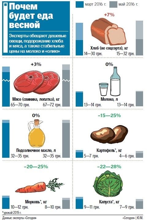 Молокопродукты, по прогнозам экспертов могут чуть (1,5—2 грн) подорожать из-за электроэнергии и топлива. Но стоимость молочки сдержит весенний рост удоев, ведь этот продукт — скоропортящийся. Останется стабильной и цена на "олию", так как ее запасов достаточно. Что касается яиц, то они существенно, до 20—22 грн/дес., подорожают лишь к началу мая (1 мая Пасха. — Авт.), а затем цена вернется к нынешним 12—15 грн/дес.