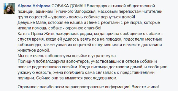 Запорожского пса, отказывающегося уйти с места гибели хозяина, вернули домой