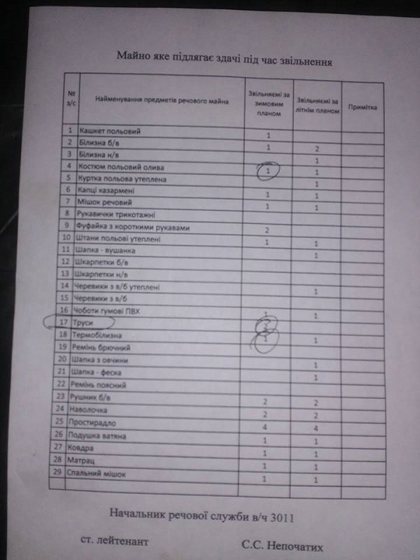Список на первый взгляд довольно обычен: полевой костюм, тапочки для казармы, трикотажные рукавицы и так далее. Но 17-й пункт в списке удивил буквально всех – нацгвардейцев просят вернуть… трусы.