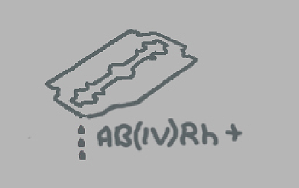 - На груди слева татуировка в виде изображения лезвия для бритья и группы крови под ним «AB (IV) Rh +» (4-я группа крови, резус положительный).