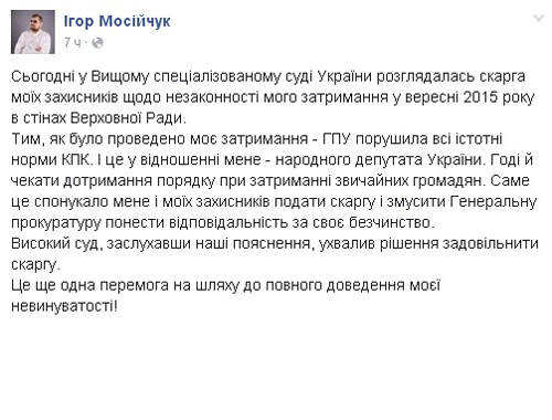Народный депутат Игорь Мосийчук сообщил, что Высший специализированный суд Украины (ВАСУ) удовлетворил жалобу защиты парламентария о его задержании в сентябре 2015 года. Об этом Мосийчук написал на своей странице в Facebook.