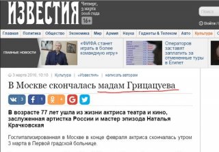 Некролог о Натальи Крачковской, опубликованный в российском издании «Известия» вызвал возмущение в Twitter. Новость о смерти актрисы вышла в «Известиях» с заголовком «В Москве скончалась мадам Грицацуева».
