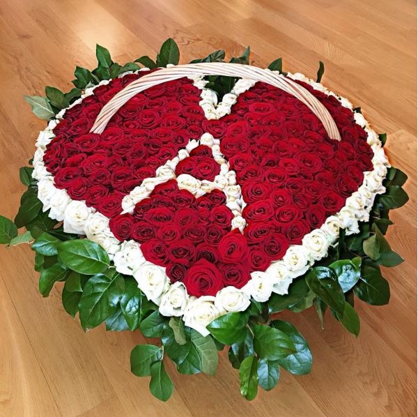 На фото, опубликованное в Instagram, изображен огромный букет из красных роз, выложенных в корзине в форме сердца. А по краям все это было щедро украшено зелеными листьями.