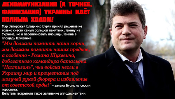Активисты распространили в российских и пророссийских сообществах информацию о решении городского головы Запорожья Владимира Буряка переименовать площадь Ленина в площадь Шухевича.