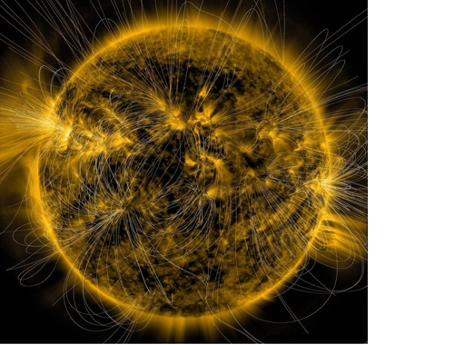 NASA представило изображение, иллюстрирующее магнитное поле Солнца. Линии магнитного поля были нанесены на снимок Солнца, полученный Обсерваторией солнечной динамики 12 марта 2016 года.Снимок был опубликован на официальном сайте NASA. Наложение линий магнитного поля на изображение позволит специалистам определить, каким образом магнетизм Солнца меняется в зависимости от процессов, которые происходят внутри и на поверхности звезды.