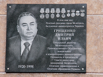 18 марта прошло торжественное открытие мемориальной доски Дмитрия Ильича Грищенко - Генерального директора завода "Мелитопольхолодмаш", человека, который не только поднял на ноги, дал второе дыхание заводу, но и много сил положил на развитие нашего города. Ее установили на фасаде дома, адрес которго пр. Б. Хмельницкого 25