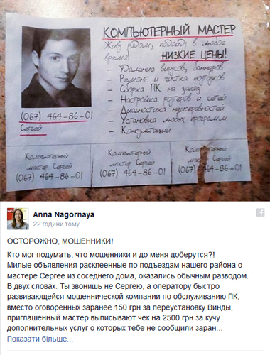 «Ты попадаешь не на Сергея, а на оператора быстро развивающейся мошеннической компании по обслуживанию ПК. Вместо оговоренных заранее 150 грн за переустановку операционной системы Windows, приглашенный мастер выписывают чек на 2500 грн за кучу дополнительных услуг, о которых тебе не сообщили заранее и не спросили о необходимости. Например, обжимка кабеля за 75 грн для прямого подключения к домашнему роутеру», - написала девушка.