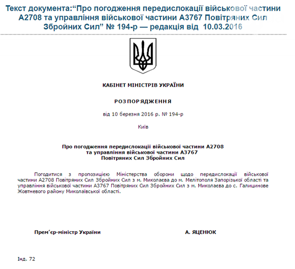 Кабинет Министров перевел воинскую часть А2708 Воздушных сил из Николаева в Мелитополь Запорожской области. Об этом 061 стало известно из распоряжения №194 от 10 марта, опубликованного на официальном сайте Кабмина.