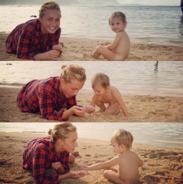 Коллаж из трех снимком на пляже получился довольно милым и забавным: Хайден в клетчатой рубашке красного цвета играет со своей дочкой, сидя на песке возле моря.