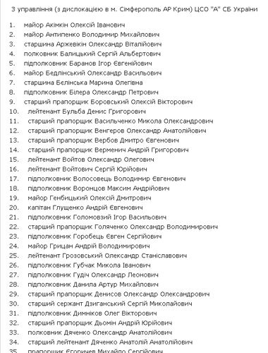 Служба безопасности обнародовала полный список бывших коллег, которые после аннексии Крыма изменили присяге и перешли на сторону оккупантов.