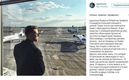"Вчера в Питере мы провели 2 концерта: большой сольный и ночной. Сразу после них полетели в Киев с пересадкой в Минске. И вот, когда мы с командой долетели до вас, меня без объяснения причин не пустили на территорию Украины ", - написал он в комментарии к фотографии из аэропорта.