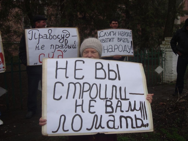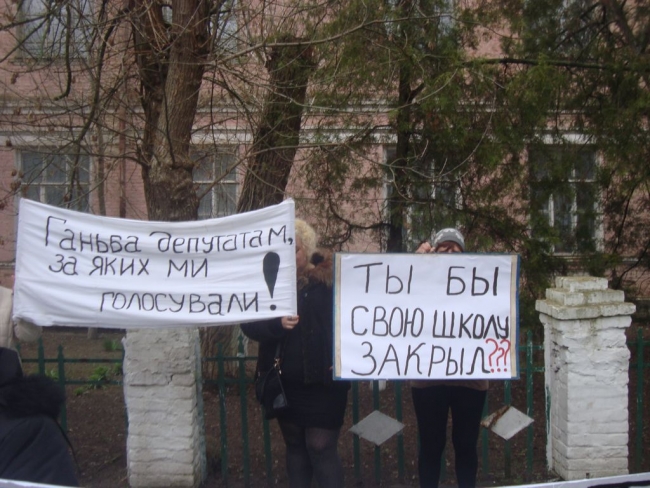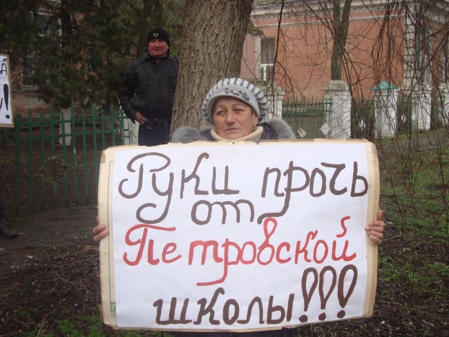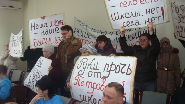 С этими плакатами люди пришли под стены Акимовского райсовета 31 марта, а затем пошли и на сессию, по завершении которой вступили в довольно жесткие словесные стычки с руководством района (нужно отдать должное руководству района – они от встречи не уклонялись). Люди требовали оставить в селе школу, а районные власти напирали на качество образования, поясняя, что в маленькой школе дети не получат хороших знаний. При этом обе стороны горестно вздыхали, когда речь заходила о финансах – будь их много, вопрос закрытия (оптимизации) школы в селе Петровка вряд ли был бы поднят. В зале во время переговоров с петровцами находились и головы сельсоветов, которых руководители района попросили остаться в зале и усилить их позицию в этом споре.