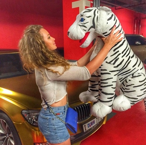 На фото Яна позирует в коротеньких шортиках с большим плюшевым тигром.