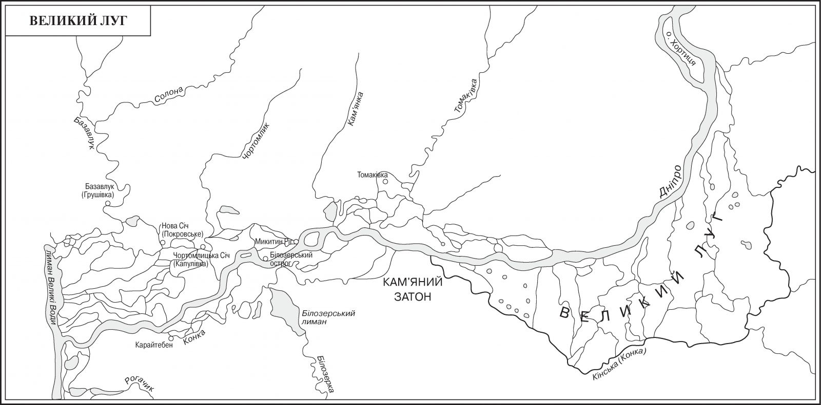 Великий Луг - историческое название огромных речных плавней, размещавшихся в XVI - XVIII веке ниже порогов на левом берегу Днепра между Днепром и его левым притоком Конкой, по которой в XVIII веке проходила граница с Крымским ханством. Вся эта местность принадлежала Запорожской Сечи.