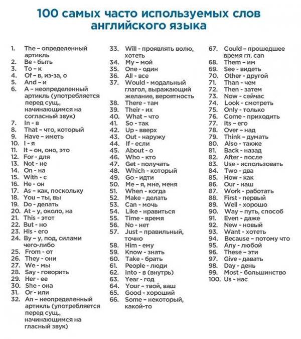 Исследование выявило, что всего 100 самых часто используемых слов английского языка покрывают около 50% любого английского текста (речь не идет о специализированной и научной литературе).