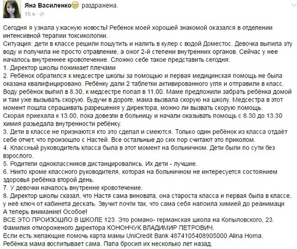 "Дети в классе решили пошутить и налить в кулер с водой "Доместос". Девочка выпила эту воду и получила не просто отравление, а ожог 2-й степени внутренних органов. Сейчас у нее началось внутреннее кровотечение", - рассказала Василенко.