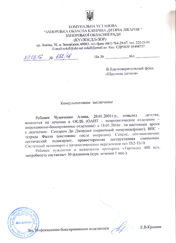 Алине постоянно требуются дорогостоящие лекарства. Подробная информация об истории болезни девочки, отчет о поступивших и израсходованных пожертвованиях, а также информация о счетах для благотворительной помощи находится на сайте общественной организации Дети Запорожья.