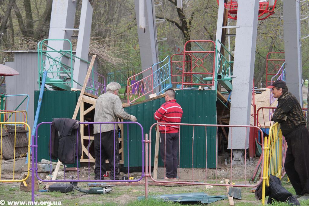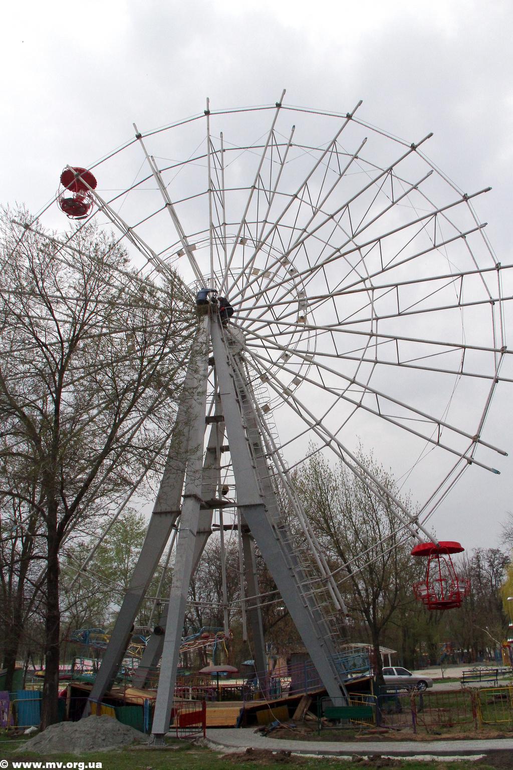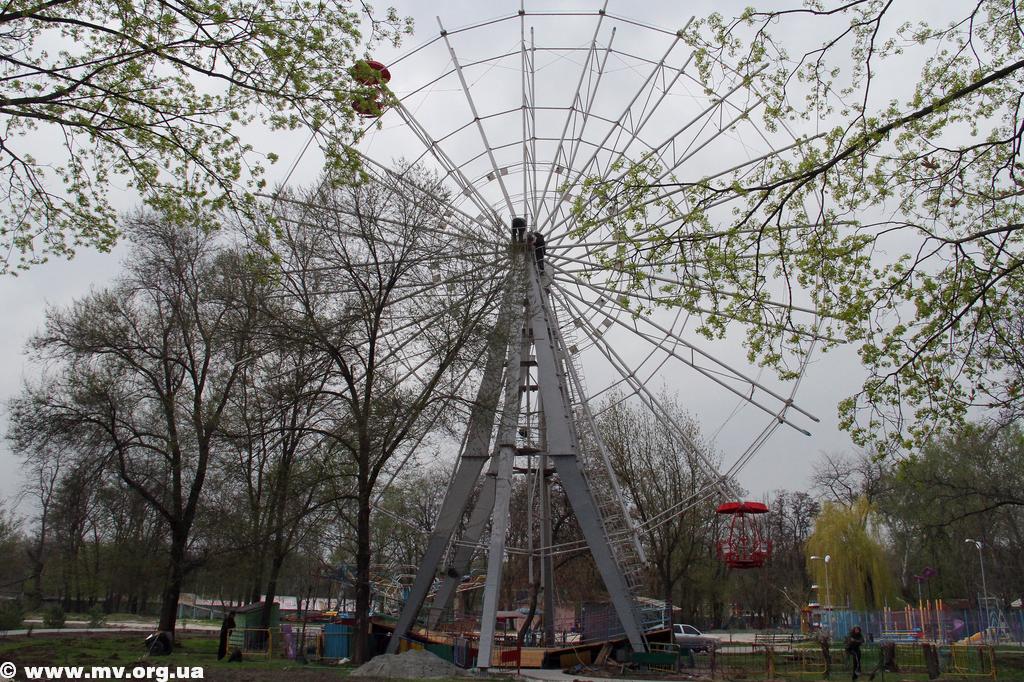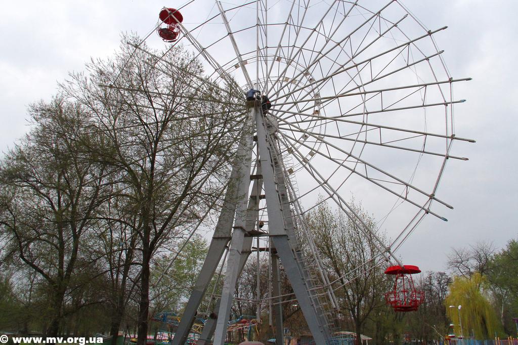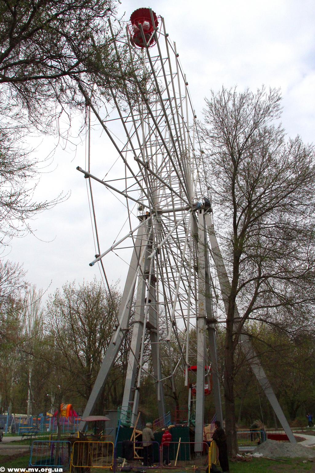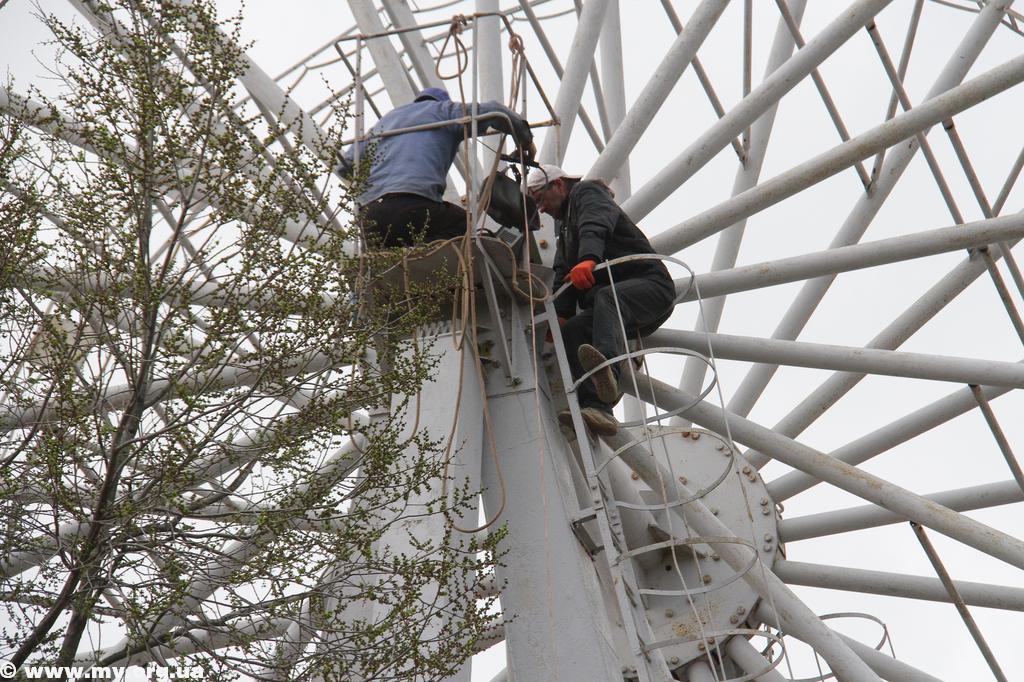 Колесо обозрения в парке культуры и отдыха им. М. Горького преображается. Аттракцион покрасили и сегодня уже начали навешивать на него отреставрированные корзины.