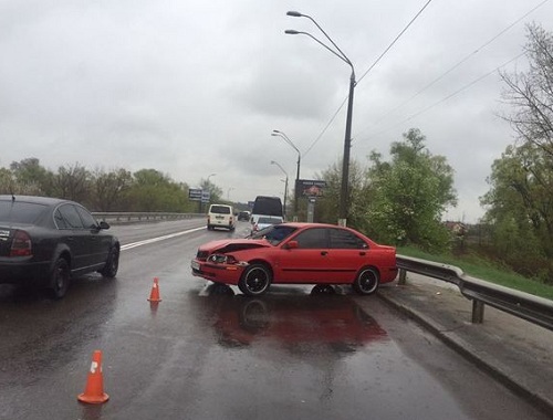 В Киеве иномарка влетела в отбойник на мокрой дороге, повредив микроавтобус