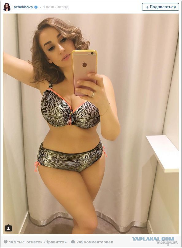 "Вы только посмотрите на это сенсационное фото! Анфиса Чехова примерила новенький купальничек, и заселфила его сразу в инстаграм. И что мы видим? Караул! У неё отсутствует пупок. Хотя сама она этот факт отрицает.