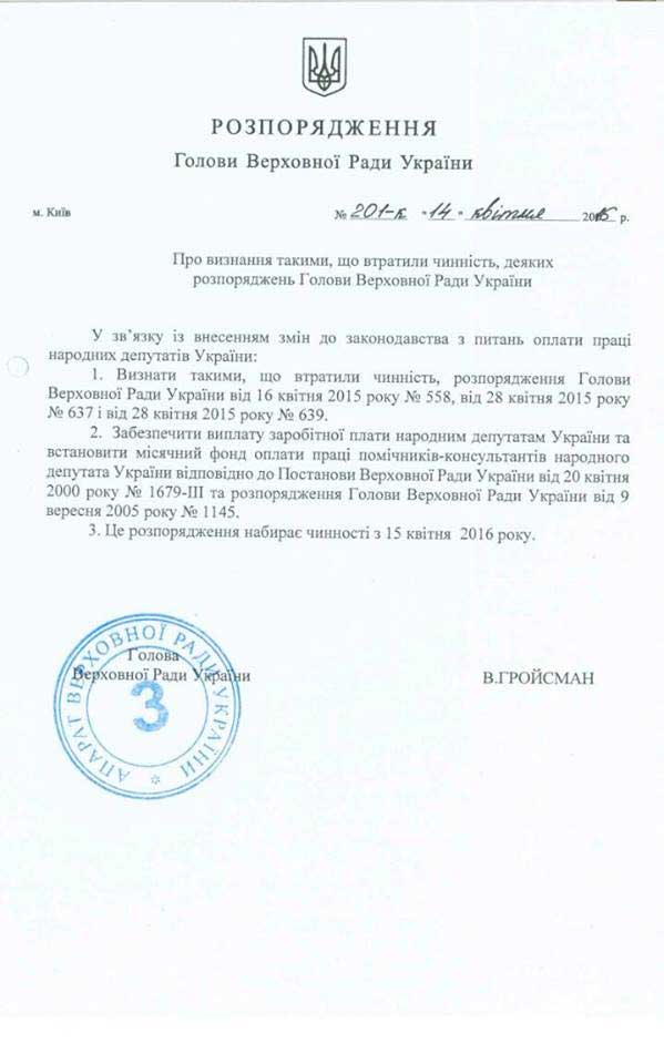 По ее словам, это было последнее распоряжение Владимира Гройсмана на должности спикера Верховной Рады.