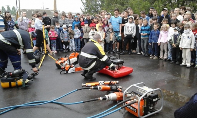 На территории Терпеньевской общеобразовательной школы-интерната сегодня было много спецтехники. Пожарно-спасательные автомобили, гидравлические ножницы, пожарные рукава и прочее оборудование понадобилось спасателям, чтобы показать его воспитанникам интерната и рассказать о своей работе в рамках общественной акции «Предотвратить. Спасти. Помочь».