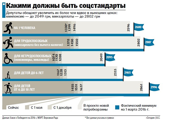 В Минсоцполитики нам сообщили, что подали на обсуждение Кабмина проект новой потребкорзины еще в начале года: по расчетам ведомства, по состоянию на 1 марта фактический расход составляет 2680 грн на человека. В правительстве признают, что повышать стандарты обязательно нужно. Но, по данным Минфина, повышение прожминимума вдвое обойдется бюджету в 354,4 млрд грн! В том числе на пересчет зарплат бюджетникам по Единой тарифной сетке — 225,4 млрд грн, пенсионерам — 107,7 млрд грн, а на госсоцпомощь малообеспеченным — 21,3 млрд грн. При этом вся расходная часть бюджета на 2016 г. составляет 668 млрд грн. То есть ее надо увеличить более чем в 1,5 раза.