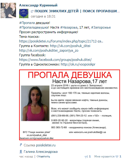 Всеукраинская организация «Поиск пропавших детей» сообщает, что девушка пропала 23-го апреля. Настя была одета в верую вязанную кофту, темные джинсы и темные кроссовки.