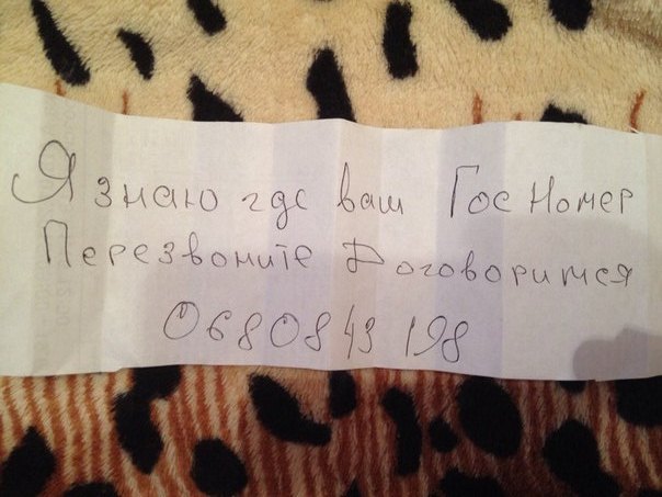 Злоумышленники оставили номер телефона 068-084-31-98 со словами «Перезвоните. Договоримся». «Мы позвонили мошеннику. Он потребовал 300 грн. и пообещал, что после получения средств на счет мобильного оператора мы узнаем, где лежат наши номера. После этого мы с мужем съездили в МРЭО, где нам ответили, что официальное восстановление номеров обойдется в 500-600 гривен. В милиции посоветовали поискать во дворе, где мы живем, и уже если не найдем, то написать заявление. Заявления такого рода у них появляются ежедневно. После недолгих поисков муж нашел чужие номера (сейчас супруги пытаются найти их владельца через соцсети), а затем получил назад и свои - детвора их откопала в песочнице», - рассказала Анастасия.