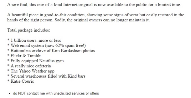 Пранкеры также указали, что покупатель получит автоматически принадлежащие компании Tumblr, Flickr и Yahoo Weather, а также почтовую систему, которая по их словам "свободна от спама на 62%".