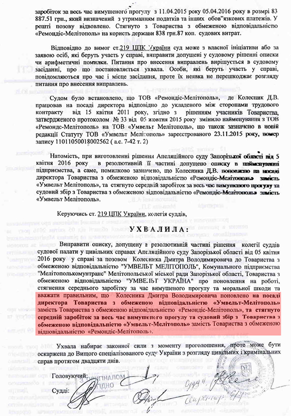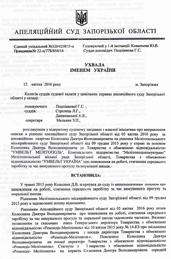 Д. Колесник подчеркнул, что восстановить его в должности директора, по решению и постановлению Запорожского апелляционного суда №320/4258/15-ц, должен именно руководитель ООО "Умвельт-Мелитополь", и предоставил соответствующий документ.