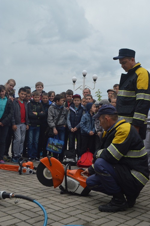 После лекции дети имели возможность ознакомиться с техническими характеристиками спасательного автомобиля и боевого снаряжения. Спасатели рассказали, в каких случаях используется то или иное оборудование. Больше всего поразил всех бензорез, с помощью которого спасатели ликвидируют последствия ДТП, и специальные ножницы. Окружив бойцов и автомобиль, дети с чрезвычайным интересом рассматривали боевое снаряжение и примеряли его на себя.