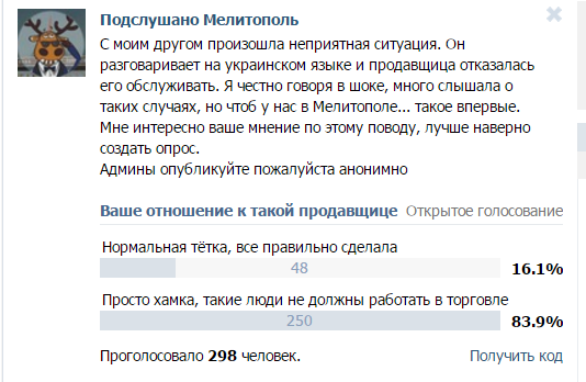 Показателен опрос, размещенный под сообщением, в котором предлагалось выразить свое отношение к событию. Буквально за несколько минут в нем приняли участие сотни человек, причем, в нашем русскоговорящем городе подавляющее большинство негативно отнеслось к действиям продавца.