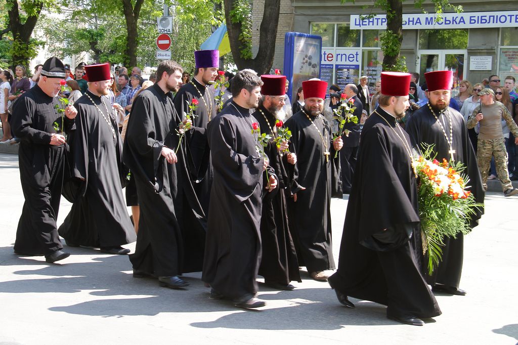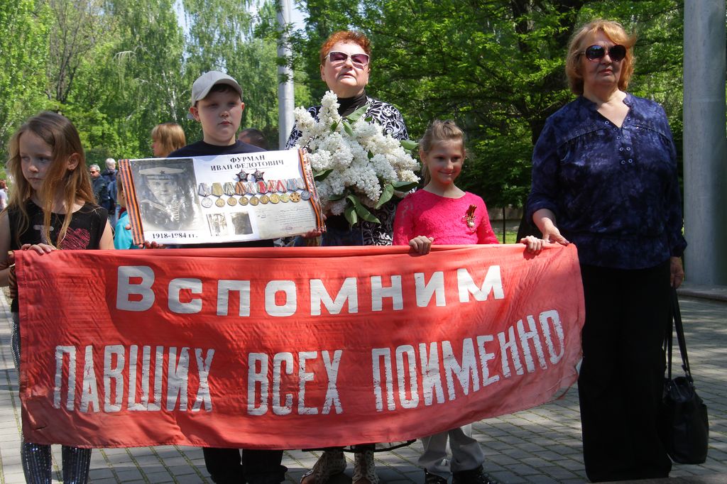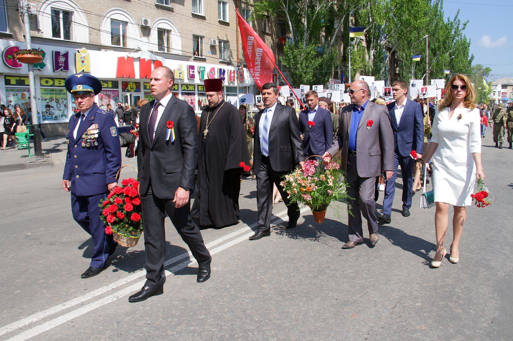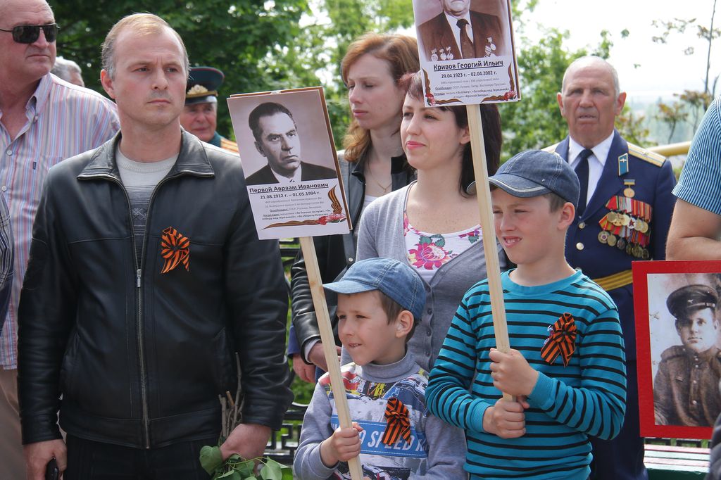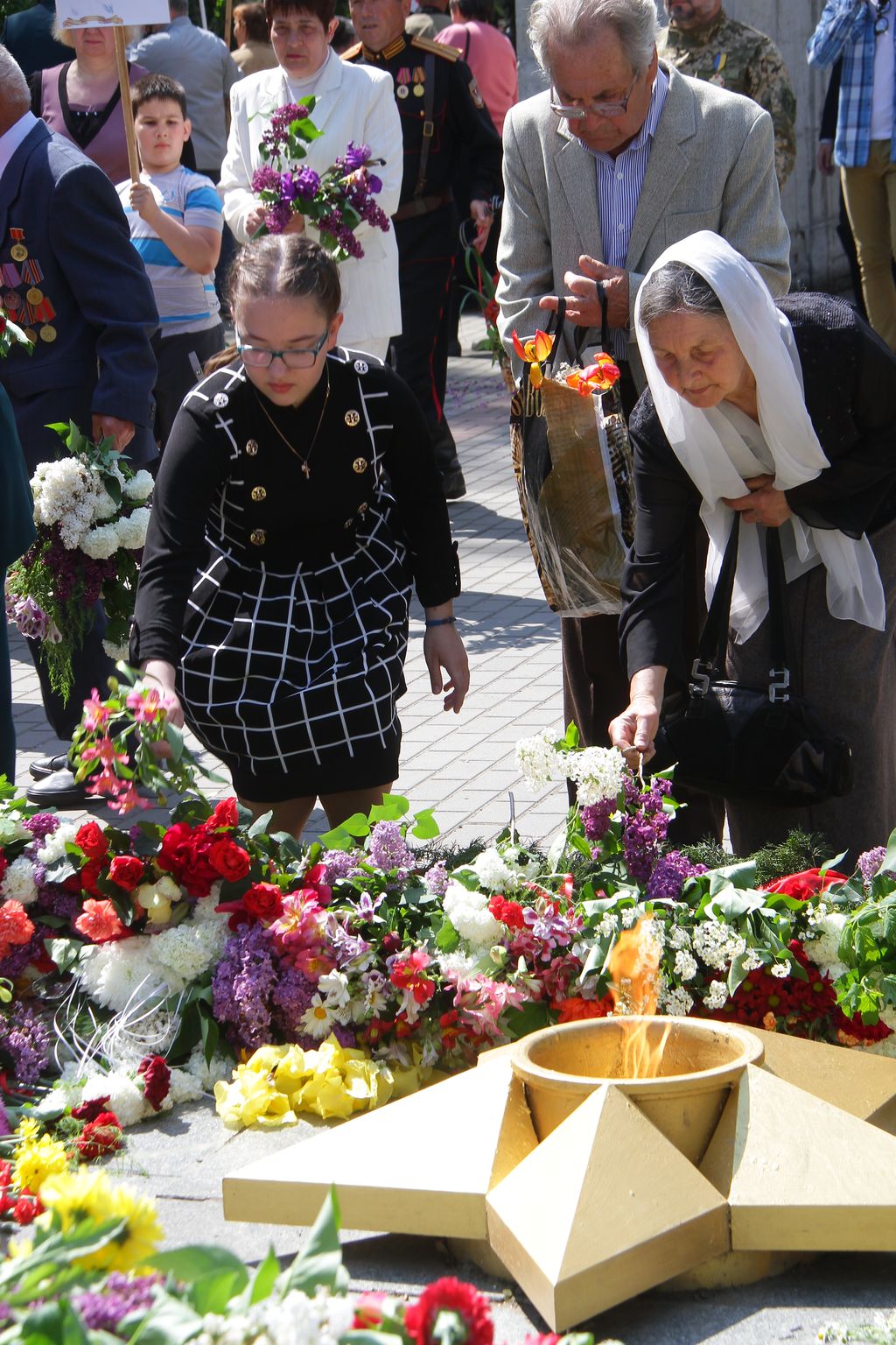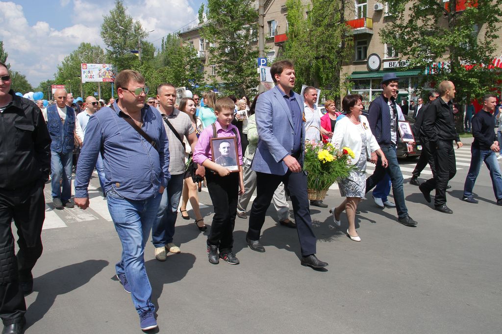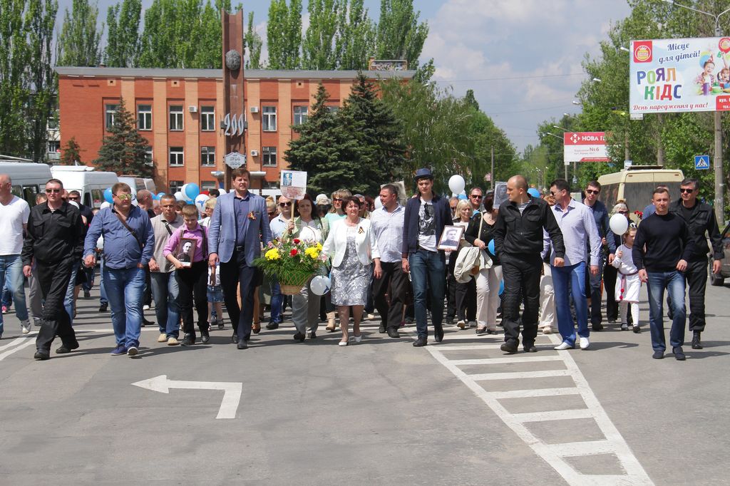 Затем участники мероприятия выстроились в огромную колонну, которая прошла по проспекту Б. Хмельницкого и свернула к Братскому кладбищу. Флаги, цветы, таблички с фотографиями и фамилиями солдат Победы несли в колонне их дети, внуки и правнуки. Обратил на себя внимание тот факт, что по обеим сторонам проспекта, как это было принято в прошлые годы, не было "живого коридора" школьников. На этот раз они были задействованы только в несении почетного караула на Братском кладбище.