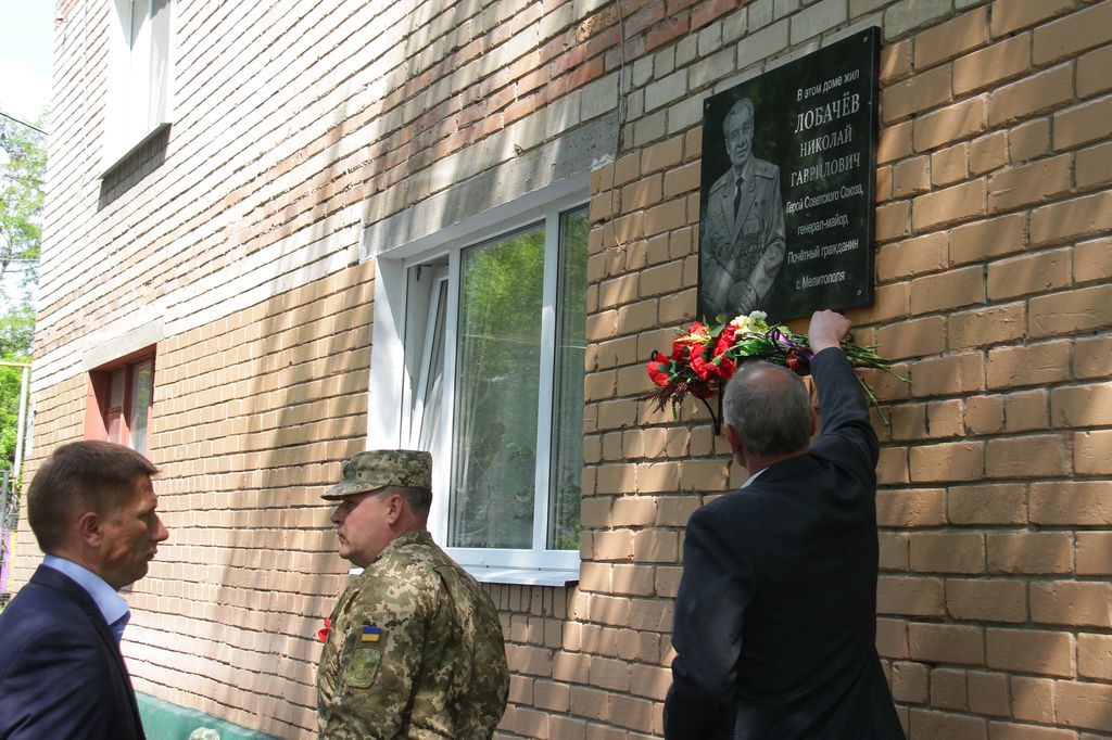 В это же время представители городской власти, военкомата, совета ветеранов и военнослужащие, собрались возле дома, где жил Герой Советского Союза, генерал-майор Николай Лобачев. Он очень ждал Дня Победы, но не дождался всего лишь пару недель, умер в конце марта прошлого года. На доме, где он жил, установлена мемориальная доска. К ней и возложили цветы собравшиеся. "Мы начали этот день с возложения цветов к мемориальной доске почетного гражданина Мелитополя, ветерана Великой Отечественной войны, председателя городской организации ветеранов войны и труда Ивана Николаевича Захари на доме 101 на ул. Ленина, где он жил. И завершаем церемонию празднования возложением цветов к мемориальной доске последнего Героя Советского Союза в Мелитополе Николая Гавриловича Лобачева", - сказала управделами исполкома Елена Дубинина.