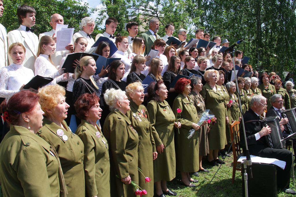Когда голова колонны приблизилась к входу на мемориал, ожидавшие здесь мелитопольцы аплодисментами встретили и живых ветеранов, и фото уже ушедших из этого славного строя. Традиционно у скульптуры Родины-матери на Братском кладбище выступал народный хор ветеранов "Фронтовичка", артисты хоровой капеллы "Таврия". Криками "Браво!" и аплодисментами горожане встретили "День Победы" в их исполнении, многие подпевали артистам.