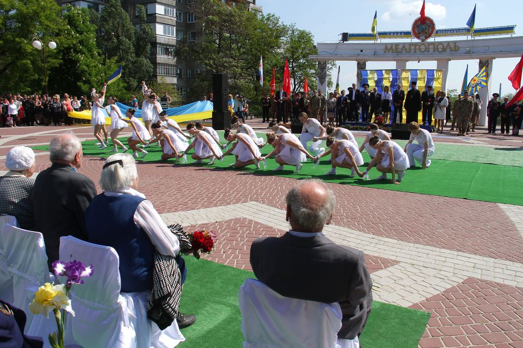 Возле арки на площади Победы разместили импровизированную сцену, настоящих героев дня - ветеранов усадили на стулья напротив. В толпе горожан виднелись флаги общественных организаций ветеранов Афганистана и ветеранов пограничных войск, флаги родов войск и красные флаги воинских частей, которые освобождали Мелитополь в 1943 году. Огромное желто-голубое полотнище государственного флага Украины развернули возле сцены, оно потом было вынесено во главу праздничной колонны. Сначала слово для поздравлений было предоставлено городскому голове Мелитополя Сергею Минько, который отметил, что День Победы для всех является священным праздником.