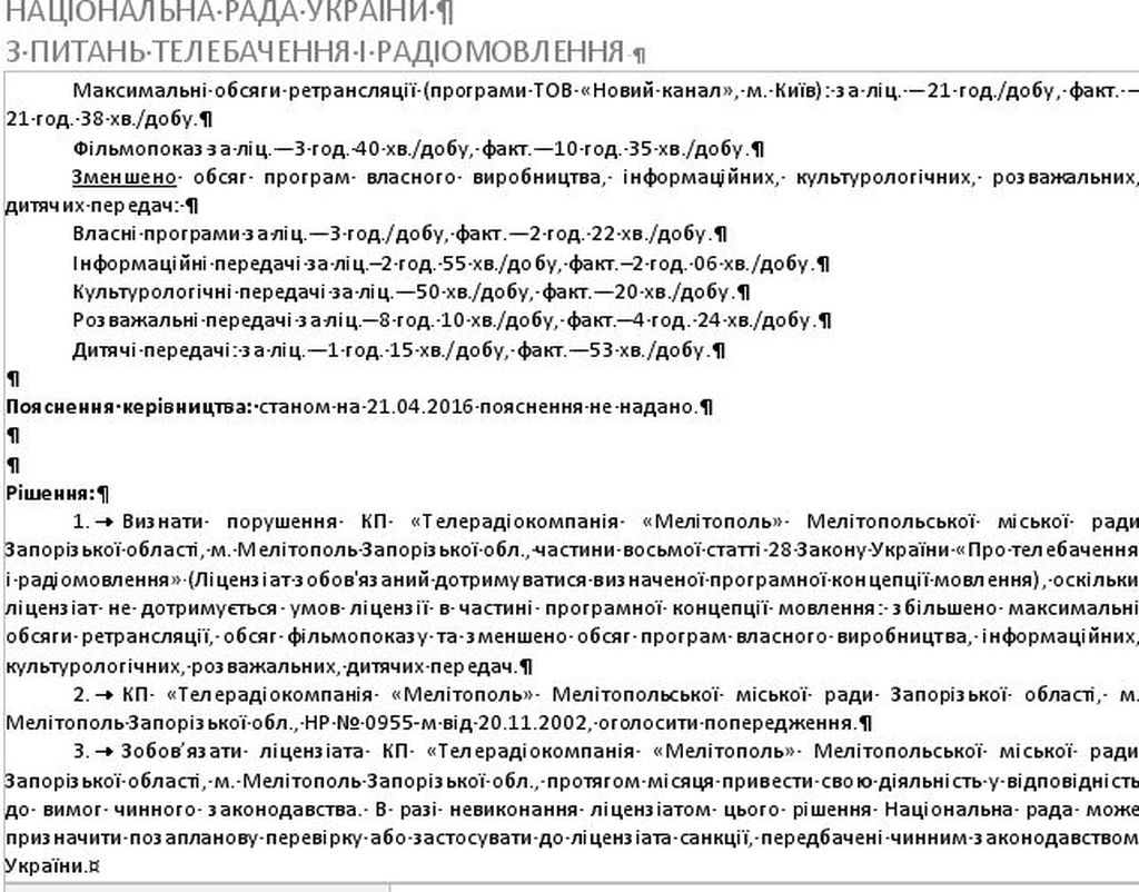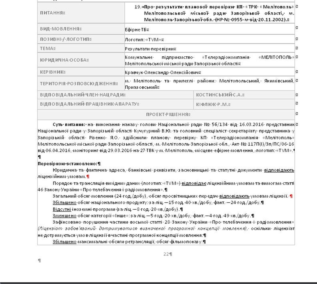 Вчера, 12 мая, в Киеве на заседании Нацсовета Украины по вопросам телевидения и радиовещания среди прочих вопросов рассматривались и результаты плановой проверки мелитопольского КП "ТРК "Мелитополь", проведенной перед окончанием действия лицензии на вещание.