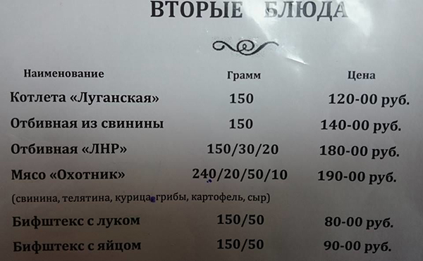 В сети появились фотографии меню столовой в "Луганской народной республике", в котором шокируют не столько цены, сколько названия самих блюд.