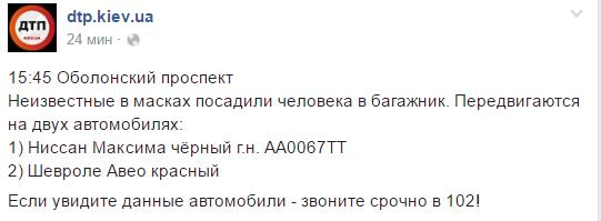 "15:45 Оболонский проспект. Неизвестные в масках посадили человека в багажник. Передвигаются на двух автомобилях", - говорится в сообщении.