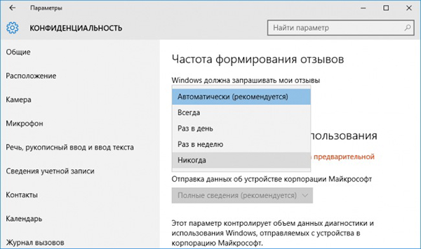 Далее откройте пункт «Конфиденциальность» — «Отзывы и Диагностика» выберите пункт «Никогда» в списке «Windows должна спрашивать мои отзывы».