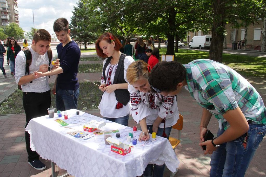 Возле столика второкурсников факультета математики, информатики и экономики - аншлаг. Молодежь и дети выбирают флаги стран Европы, а студенты наносят их на щеки. Мастер-пряничник Ирина Гамота помогает украсить разноцветной белковой глазурью пряники в виде сердечек, рубашечек-вышиванок, цветочков. "Принесите счастье в дом - сделайте своими руками магнит-топиарий", - приглашает преподаватель кафедры экологии и зоологии Татьяна Матрухан. На уже подготовленное "деревцо" с магнитиком все желающие наносят краску, украшают ротангом, сезалем, зернами кофе, кружевами и висюльками.