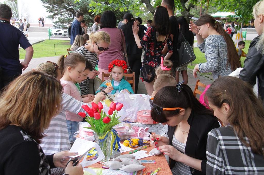 За памятником Кобзарю расположилась "Лаборатория добра" - мастер-классы по изготовлению украшений и цветов из лент, салфеток и гофрированной бумаги, плетению браслетов, созданию картин в технике "квиллинг", разукрашиванию пряников, изготовлению магнитов-топиариев "Дерево счастья", изготовлению фигурок из бисера. Детвора и взрослые с удовольствием погрузились в атмосферу творчества. А помогали им в этом студенты Учебно-научного института социально-педагогического и художественного образования МГПУ. Как объяснила ассистент кафедры социальной педагогики, социальной работы и дошкольного образования Ирина Яковенко, различным техникам студенты обучаются на уроках по методике преподавания труда, изобразительного искусства и художественной культуры. Теперь у них есть прекрасная возможность показать, чему они научились, и попрактиковаться.